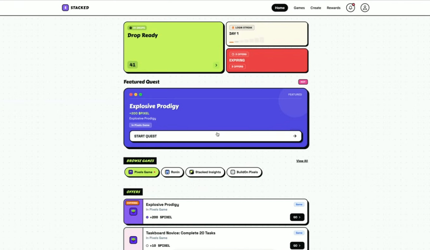 Stacked can reward anything: in-game items that aren’t Web3, Web3 in-game items, or even other apps/businesses that want to increase engagement (e.g. an exercise app that wants users to increase their daily steps).