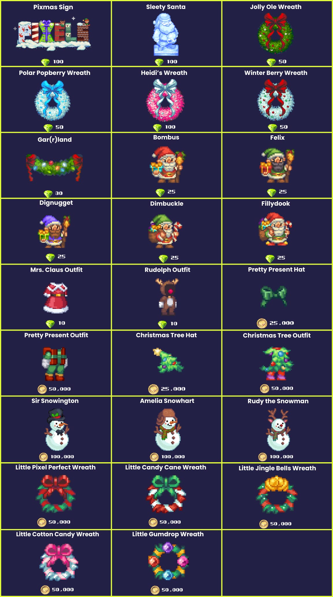 There are tons of new Christmas decorations, including wreaths, outfits, a Christmas Pixels sign, and much more. Let’s get festive! ❄️